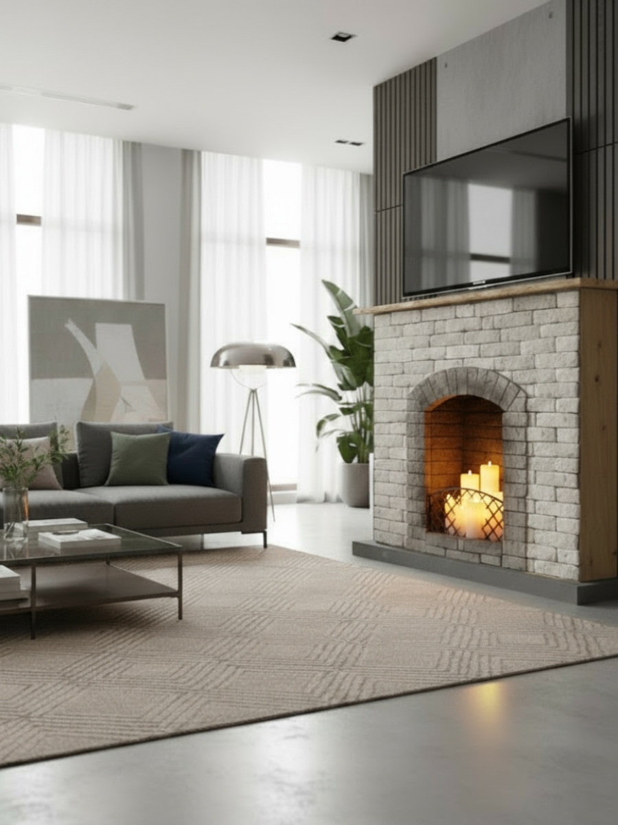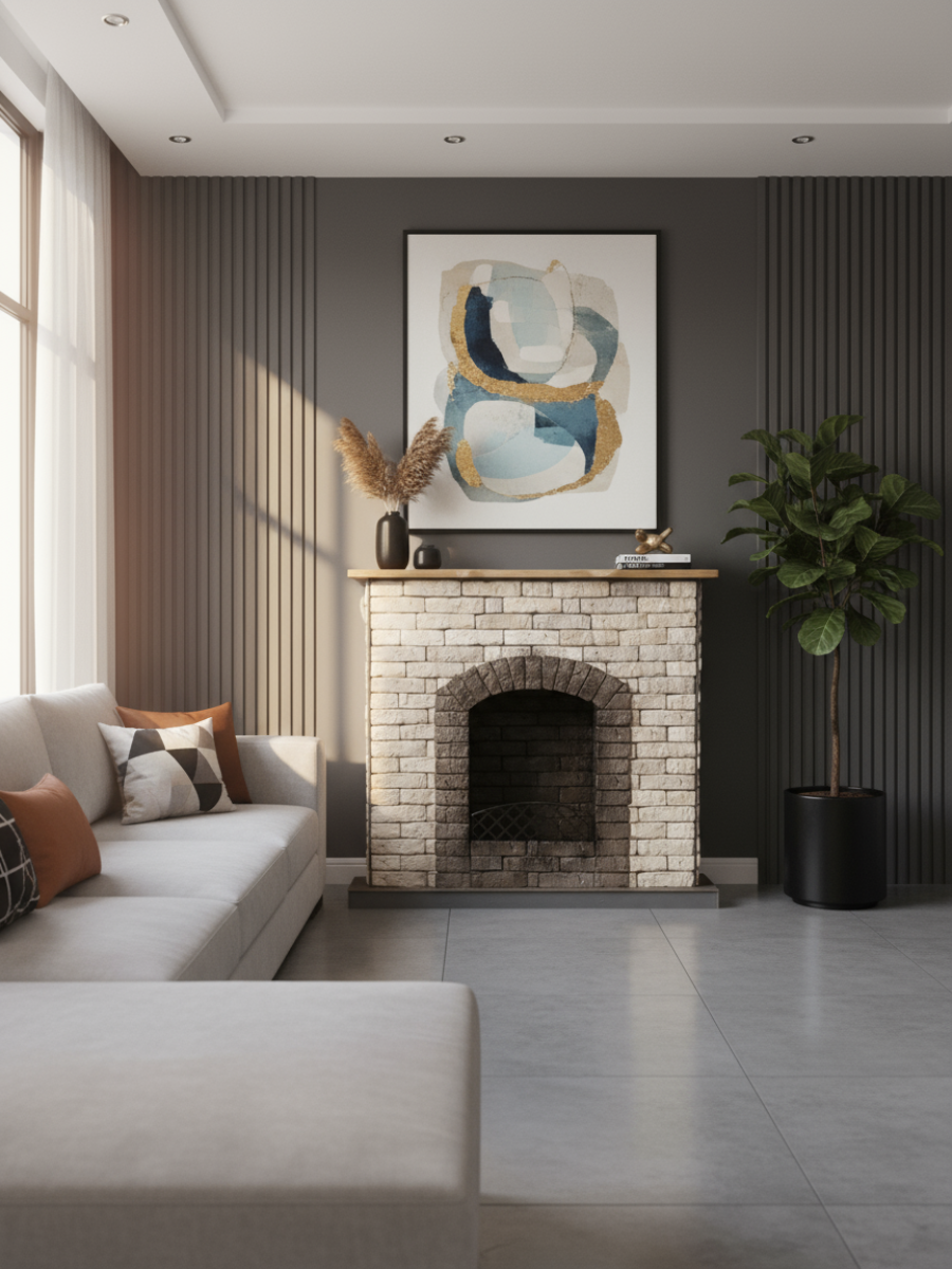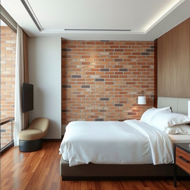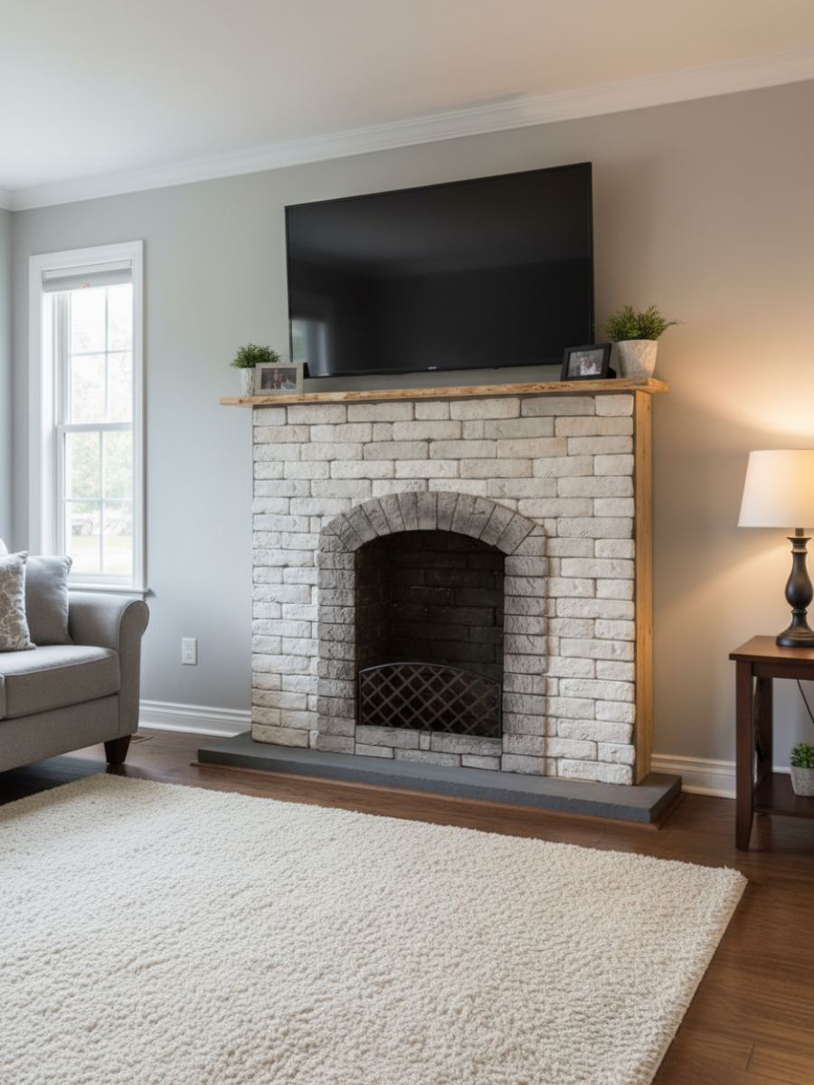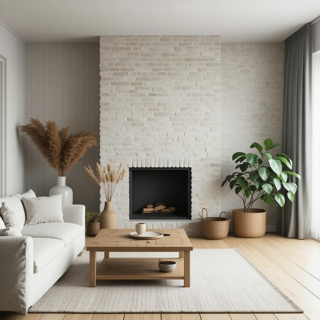 💡 Можно совместить: дерево на полу + белёный кирпич на одной стене.